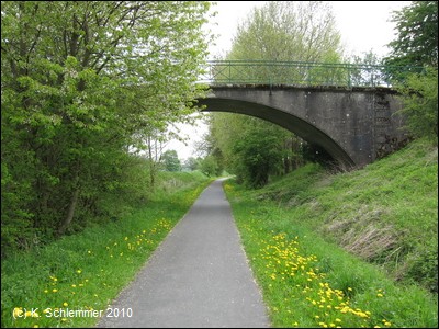 Eine alte Brücke überquert die Trasse. "Begegnung" heißt das folgende Kunstwerk.