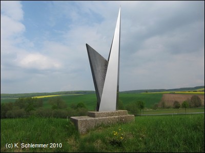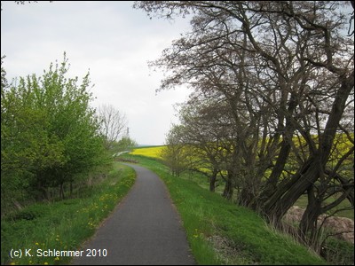 Kerzengerade durchzieht der Radweg die Frühlingslandschaft. Manche Skulpturen, wie diese "Mitra", liegen fast versteckt am Rande der Strecke.
