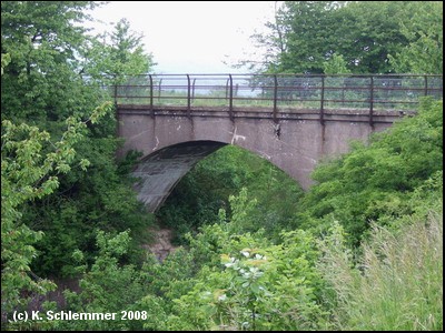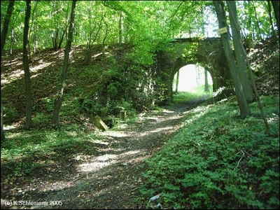 Der Einschnitt der Bahnstrecke vor der Feldmühle ist unpassierbar und muss umgangen werden. Eine alte Brücke überspannt die Trasse.