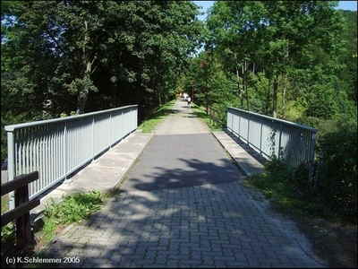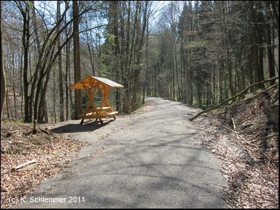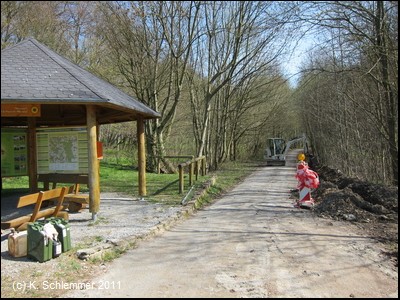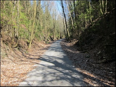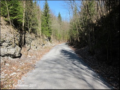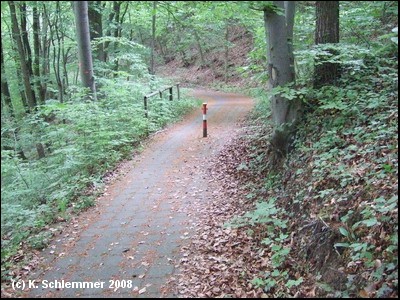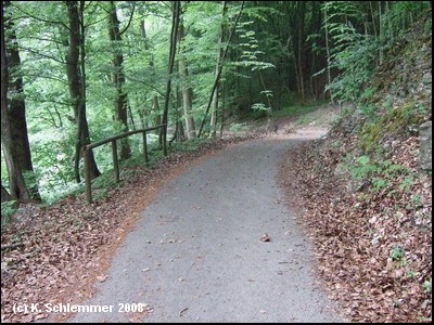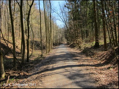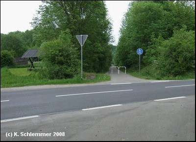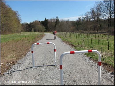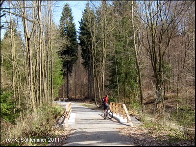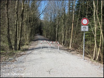 Hier war im April 2011 noch die Leitplanke im Weg. Dahinter beginnt ein wunderschöner Bahntrassenradweg abwärts durch den Wald.