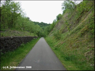 Jetzt beginnt ein neuerer Abschnitt des Radwegs auf der Bahntrasse, breit ausgebaut, mit glattem Asphaltbelag, auch für Rollstühle und Inline-Skater ein Genuss. Leider nicht pollerfrei und an der Straßenquerung der L2104 auch noch Drängelgitter mit den üblichen Umfahrungsspuren. Durch einen tiefen Einschnitt geht es weiter langsam bergauf.