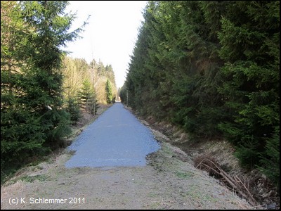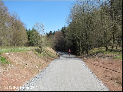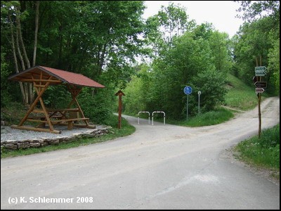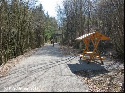 Der Scheitelpunkt der Strecke bei 427 m über NN ist erreicht. Hier beginnt der 7,5 km lange neueste Abschnitt des Radweg auf der Bahntrasse, der 2011 fertiggestellt wurde. Die Strecke ist nicht asphaltiert, sondern hat eine wassergebundene Oberfläche.