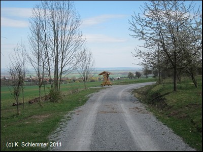 Von Oberdorla aus führt der Wirtschaftweg mäßig bergauf Richtung Weidensee (Beschilderung Unstrut-Werra-Radweg). In Weidensee geht es für ca. 400 m auf die Kreisstraße, dann biegt der Radweg links ab in den Thomasteichweg. Der kleine Wegweiser wird leicht übersehen!