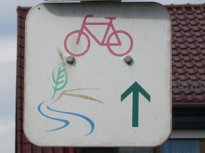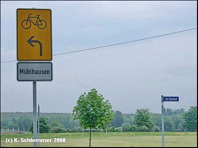 An der Kreuzung der Bahnhofstraße mit der Mühlhäuser Straße trifft man auf den Wegweiser zum Radweg nach Mühlhausen. Man muss die Straße überqueren.