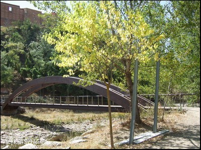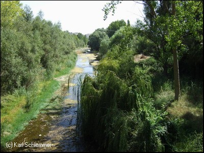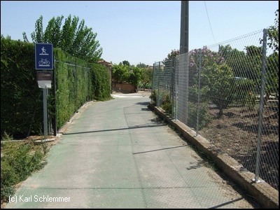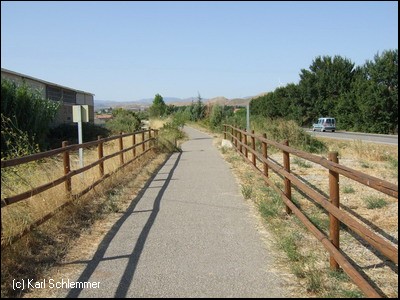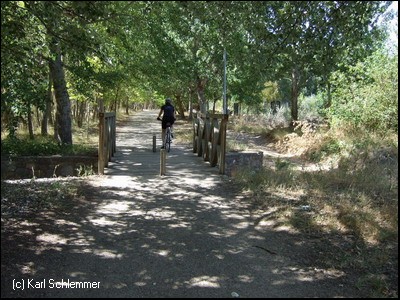 Im Parque del Cidacos, am südwestlichen Rand von Calahorra nahe der Autobahn AP-68, beginn der Radweg durch das Flusstal mit ganz geringer Steigung, zunächst Richtung Südwesten am linken Flussufer entlang. Eine neue Holzbrücke zweigt auf die andere Flussseite ab, wir fahren geradeaus unter der Autobahn durch.