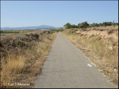 Viel Wasser führt der Fluss im September nicht. Wir verlassen die Ufer des Cidacos und biegen rechts ab auf die Bahntrasse. Als staubiger Weg führt die Bahntrasse zurück nach Arnedo, eine Alternativroute!