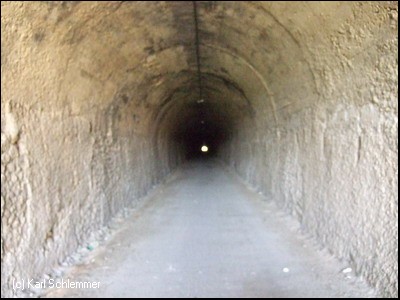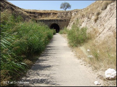 Eingeschnitten in den sandigen Boden führt der Radweg vorbei an einem Staubecken, der erste Tunnel taucht auf. Kerzengerade, Beleuchtung defekt!