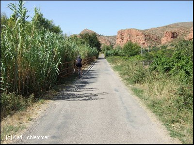 Die Via Verde del Cidacos ist ein 34 Kilometer langer Radweg auf einer ehemaligen Bahntrasse, die dem Rio Cidacos von seiner Mündung in den Ebro bei Calahorra bis zu den Thermalquellen von Arnedillo folgt. Über 300 Höhenmeter werden auf der alten Trasse problemlos bewältigt. Man fährt zunächst durch eine weite Ebene, dann aber in ein zerklüftetes, von Erosion geprägtes Gebirge, in dem noch Kolonien von Gänsegeiern zu beobachten sind. Zwei Tunnel und zwei Brücken, das klingt in Anbetracht einiger anderer Vías Verdes nicht gerade beeindruckend, aber die Formen und Farben der Landschaft, sowie die Einsamkeit der Bergwelt, in die man nach Verlassen der größeren Ansiedlungen eintaucht, machen den Reiz dieses Radweges aus.