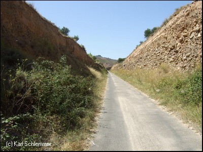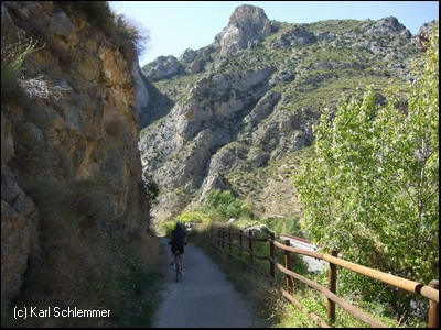 Etwas kräftiger aufwärts führt nun die Trasse, schön asphaltiert, in Richtung auf die Berge zu.