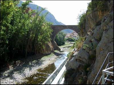 Über eine letzte Brücke geht es in den Tunnel vor Arnedillo. Der Blick fällt auf die alte Brücke im Ort.
