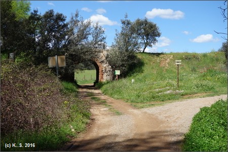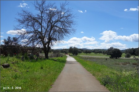 Um zum Beginn der Vía Verde zu gelangen, muss man die Bahnstrecke überqueren. Wegweiser führen zum Beginn des Radwegs am Parkplatz beim Freizeitgelände Isla Margarita. Kilometer Null!