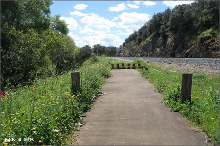 Die Straßenquerungen sind durch Schranken gesichert. Felsige Einschnitte in den Berghang.