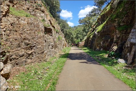 Der Radweg hat deutlich an Höhe gewonnen. Durch eine breite Schlucht...