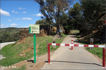 Kein Steinschlag, aber auch gefährlich: Klappsperre auf der Fahrbahn. Nun geht es durch die "Dehesa", eine typische Landschaftsform in Südspanien mit Weideland und Baumbestand.