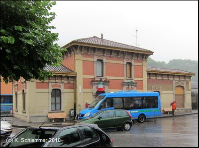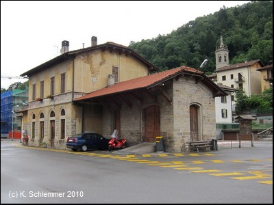 Der Bahnhof San Pellegrino Terme von der Flussseite aus gesehen, wohl früher ein wahres Schmuckstück! Auch die Bahnsteigseite ist noch sehenswert.