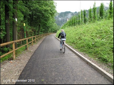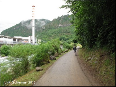 Oberhalb der Straße und des Flusses verläuft der Radweg wie auf einer Gallerie.