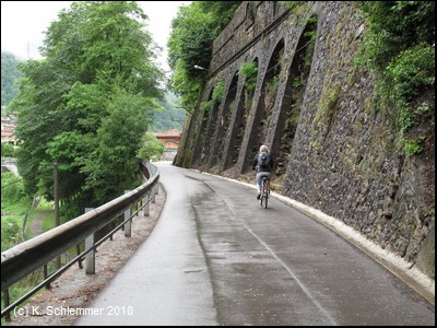 Breit ausgebaut und mit mächtigen Stützmauern gesichert führt der Radweg weiter bergauf. Der Blick fällt auf den Ort San Pellegrino.