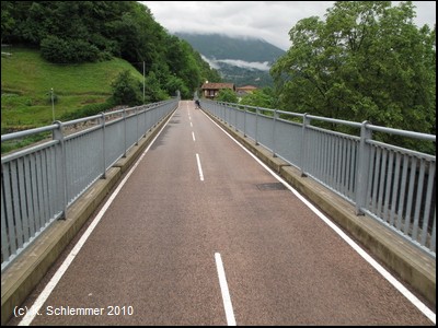 Wieder auf der Trasse. Vorsicht, auch hier gibt es Pfostensperren (Tarnfarbe)! Der Weg führt über ein mächtiges Viadukt. In der Ferne erkennt man schon die Kirche von Piazza Brembana auf der Anhöhe.
