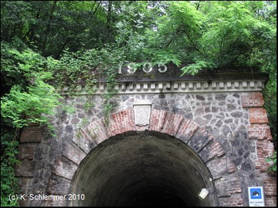 Der Blick zurück fällt auf die Jahreszahl 1905 über dem Tunnelportal.