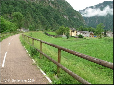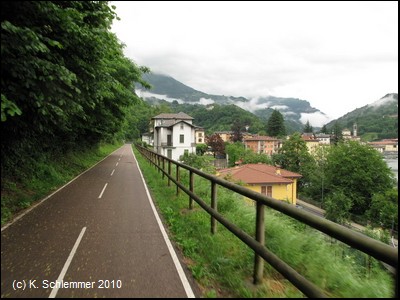 Wie durch einen Torbogen nähern wir uns dem Ort San Giovanni Bianco. Kerzengerade zieht die Trasse oberhalb der Häuser vorbei.