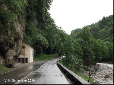 Bei der Umfahrung des Felsmassives führt der Weg an der kleinen Kapelle Chiesetta del Santo vorbei, die sich an den Felsen schmiegt. Dann geht es eine Rampe hinauf wieder auf die Bahntrasse.