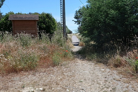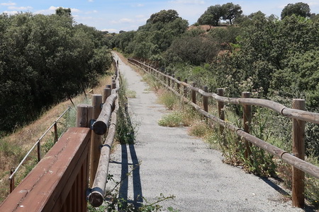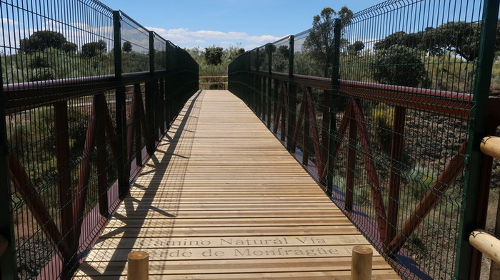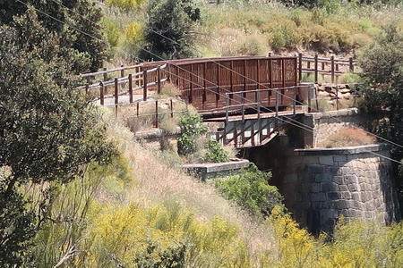 Kurz darauf ist das Ende der Vía Verde erreicht. Die Infotafel ist leer, auch ist kein Wegweiser in Sicht. Man muss vor der Brücke rechts abbiegen, durch einen Weidezaun (bitte Gitter wieder schließen!) und über die Brücke. Von dort aus erreicht man sowohl die Straße zum Fluss Tiétar (Carretera de las Urdimalas), als auch die Landstraße EX-108. Von der Brücke aus erkennt man noch die alte Bahntrasse, die in einem Bogen in die neue Bahnstrecke mündet.