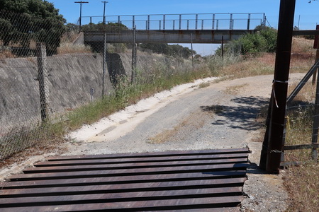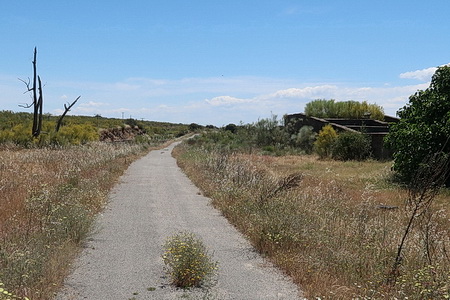Es folgt ein Damm über den Arroyo del Haza, zur Zeit völlig ausgetrocknet. Die holprige Fahrbahn wird langsam wieder von der Natur erobert.