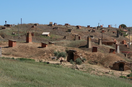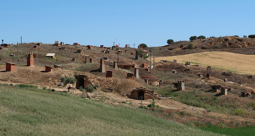 Die vielen "Schornsteine" sind wahrscheinlich die Belüftung der Bodegas. Gemeint sind hier nicht etwa Wein-Gaststätten, sondern Kellergwölbe zur Vorratshaltung. Die Bewohner dieser abgelegenen Dörfer waren weitgehend auf sich gestellt und auf eine längere Lagung von Lebensmitteln angewiesen. In den Valles de Benavente in 700-800 m über dem Meer herrschen heiße und trockenen Sommer und kalte Winter.