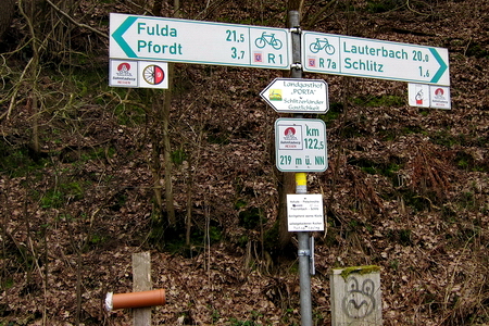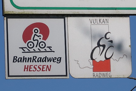 Da der Vulkanradweg auch ein Teil des Bahnradweg Hessen ist, findet man entlang der Strecke auch diese Beschilderung mit Entfernuns- und Höhenangaben. Ab Hutzdorf folgt man dem R7a.