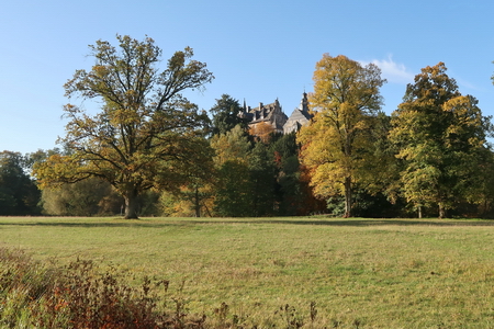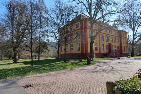 Weiter zum Schloss Eisenbach, das hinter den Bäumen auftaucht. Der Schlosspark ist für Besucher frei zugänglich.