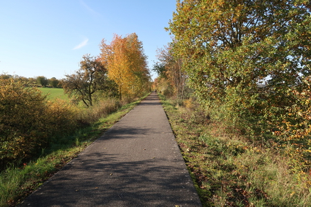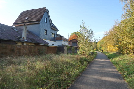 Der Weg steigt weiter an, am Hang entlang wird es etwas enger, Vorsicht bei Gegenverkehr! Dann erreicht man die Bahntrasse, die hier von einem Werksanschluss und dem ehemaligen Südbahnhof her einmündet. In einer Spitzkehre beginnt der Radweg auf der Trasse.
