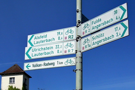 Ab Schlitz, der Burgenstadt im Vogelsbergkreis, ist der Vulkanradweg mit einem kleinen Einschubslogo ausgeschildert. Weitere Informationen haben wir am Radweg nicht gefunden. Wer mit dem Fahrrad anreist erreicht Schlitz auf dem Hessischen Fernradweg R1 z.B. von Fulda oder Bad Hersfeld aus.
