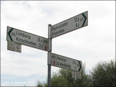 Die Beschilderung ist normgerecht, darunter befinden sich die Einschublogos "das Lahntal" und "Oranier-Fahrradroute". Ein Hinweis auf den "Weiltal Weg" fehlt. Man folgt dem Lahntalradweg entlang der Schleife um den Ort und erreicht bald den bekannten Bootstunnel mit seiner Doppelschleuse.