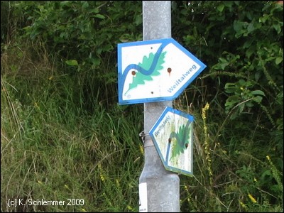 Die L3323 muss überquert werden, dann tauchen die Wegweiser des Weiltalwegs auf. Die nicht normgerechten Schilder sind teils schlecht lesbar, besonders ohne anzuhalten. Das einheitliche Logo hilft bei der Orientierung.