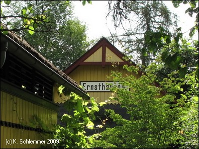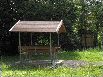 Ankunft in Ernsthausen. Vor dem alten Bahnhof eine Schutz- und Rasthütte mit Fahrradständern (Marke "Felgenkiller")