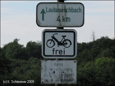 Bis zum Freibad ist der Radweg breit ausgebaut und asphaltiert. Die Schilder sind in die Jahre gekommen.