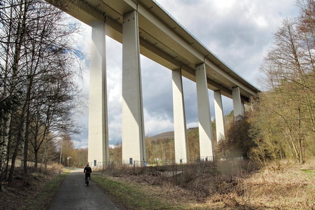 Nun wechselt der Radweg wieder auf die Bahntrasse. Die Autobahnbrücke der A45 überquert das Ambachtal (km 2,9).