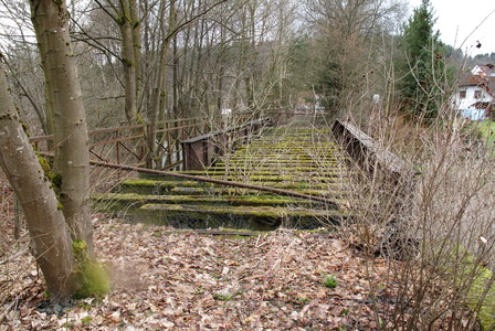 Die rostige Bahnbrücke überquert bei Herborn-Burg den Ambach und die Dill, und die leere Bahntrasse führt in einem großen Bogen zur Einmündung in die Hauptstrecke durch das Dilltal.