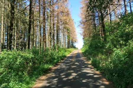 Östlich von Mademühlen verlässt der Radweg die alte Bahntrasse. Ein Asphaltweg führt über den Hügel. Der Wald ist von der Trockenheit stark beschädigt. Es geht hinab nach Driedorf.