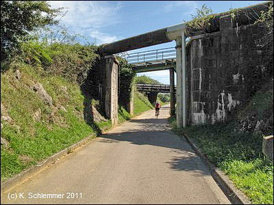 Eine alte Brücke überquert die Trasse, dann eine neue Straßenbrücke.